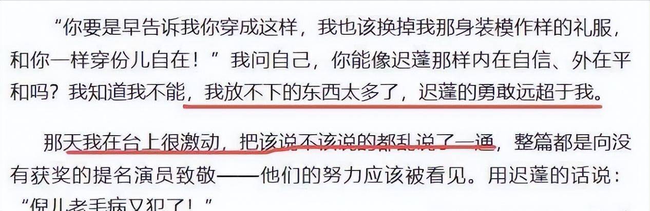 但迟蓬本东谈主绝顶低调,即是一味的演戏,除了演戏之后不出当前职何形式,就连那一场倪萍为她仗义执言的金鸡奖受奖晚会的现场,她亦然穿戴毛衣和黄色胶鞋就去了,十分的大致。
